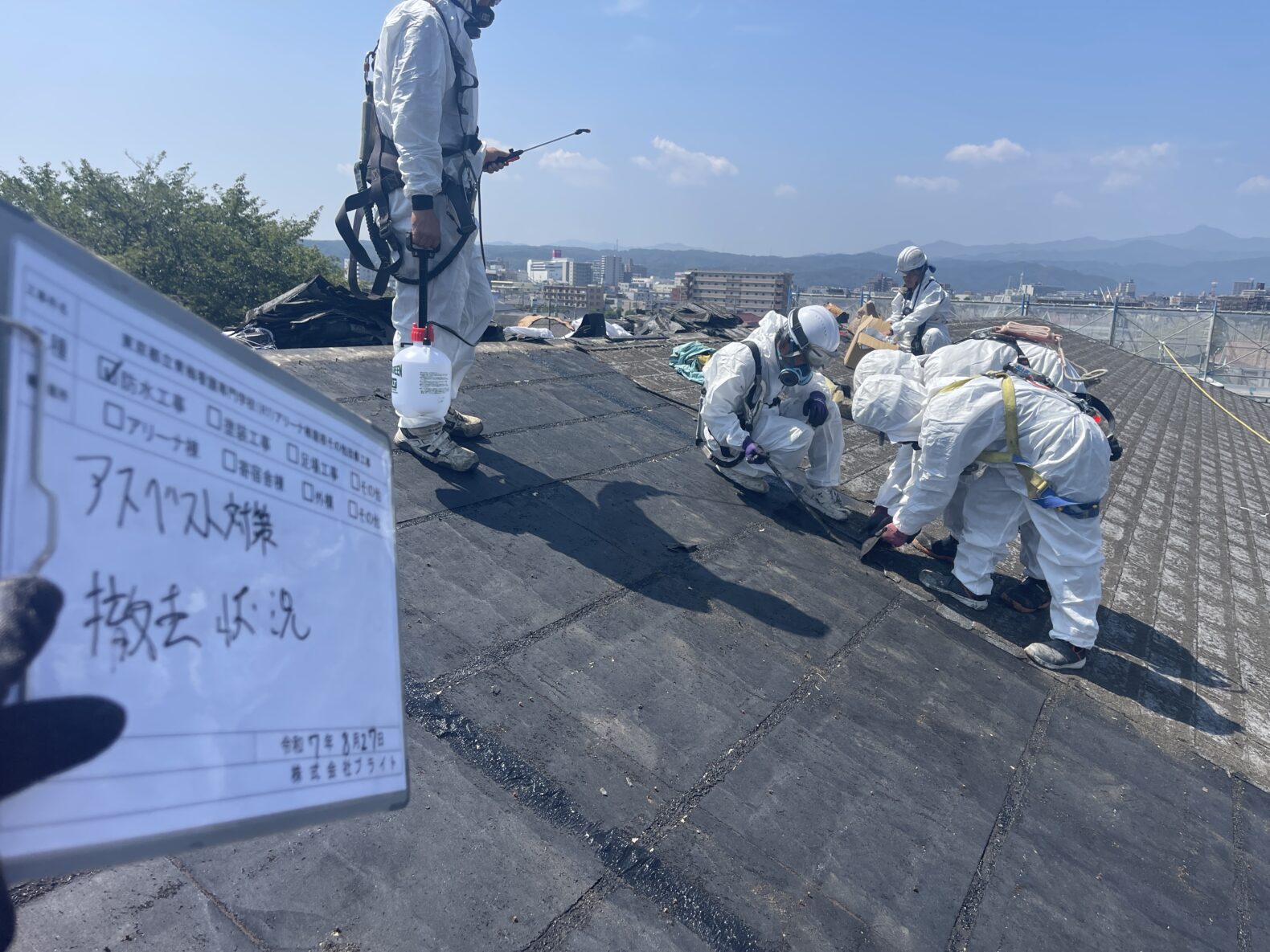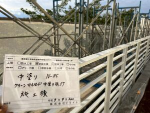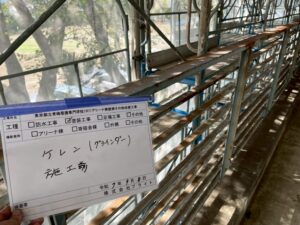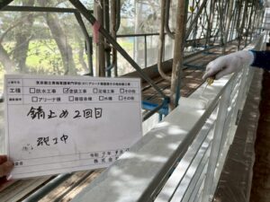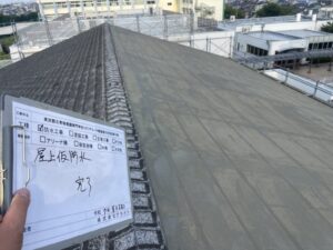 施工内容 屋上防水工事施工前 既存防水全撤去状況 仮防水施工 施工完了 鉄部塗装施工前 ケレン完了 錆止め塗布状況 中塗り写真 完了写真